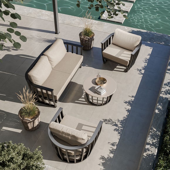 The Lucca 5 Seater Garden Lounging Set makes a bold statement with its architectural open-frame design. Available in black or teak-effect finishes, it brings a modern edge outdoors. Comfortable, supportive cushions complete the look.
