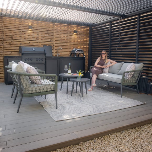 Create a comfortable, sociable seating area outdoors with the Maze Monaco 2 Seater Garden Sofa Set, designed for relaxed everyday use. The set includes a two‑seat sofa and two armchairs with supportive backs shaped for comfortable sitting. Cushions are generously padded with piped edging to provide a comfortable place to sit back and unwind. Two round coffee tables offer flexible surfaces for drinks and snacks, each topped with a marble‑effect ceramic glass finish that’s practical for outdoor use. An open rope‑weave design adds texture while keeping the set visually light. Built with a sturdy metal frame, this set is well suited to patios and garden spaces used throughout the season.