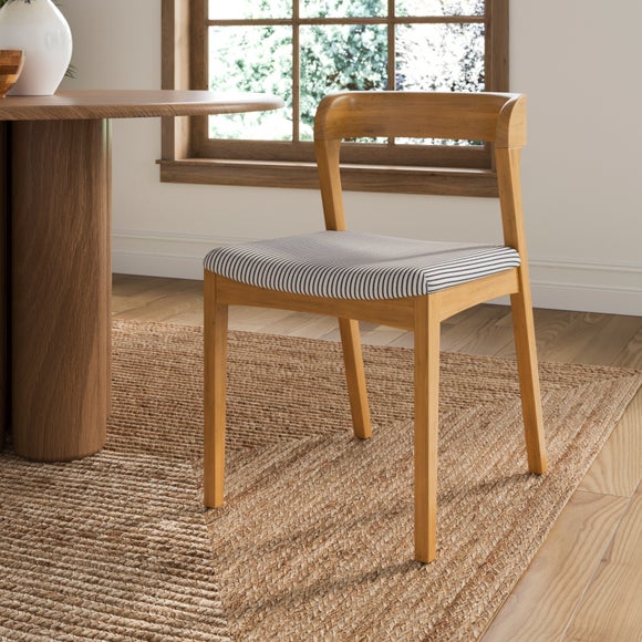 The Melia Set of 2 Dining Chairs offers a relaxed, modern look that works well in both everyday and occasional dining settings. Their curved back design supports you comfortably, whether you're sitting down for a quick snack or a longer meal. The neatly upholstered tiny stripe seats add a gentle pattern that blends easily with a range of table styles. Each chair has a light, open feel that helps keep your dining area spacious. The fabric is durable enough for regular use while still feeling soft to touch. A great option when you want seating that feels fresh and practical.