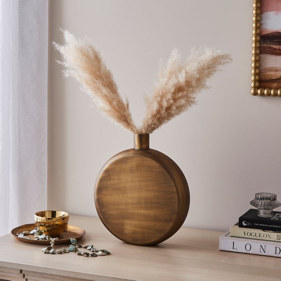 Add a bold statement to your décor with this metal flat bottle vase. Its sleek, round profile and brushed metallic finish create a contemporary feel that works beautifully with dried arrangements. Choose from two sizes to suit your space and styling needs. Display it solo or pair with other metallic accents for a cohesive, elegant look.