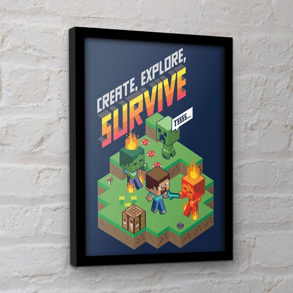 Celebrate the world of Minecraft with this vibrant framed print featuring the iconic “Create, Explore, Survive” design. Perfect for gamers and fans alike, it brings pixelated adventure straight to your walls. The slim black frame and lightweight styrene glazing offer a sleek finish while keeping it safe and easy to handle. Complete with a sawtooth bracket, it’s ready to hang in seconds. A fun and colourful addition to bedrooms, gaming spaces or playrooms.