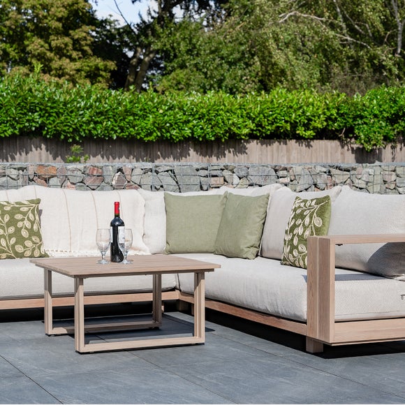 Bring a warm, natural feel to your patio with the Norfolk Leisure Darlington Wood Look Aluminium Corner Set, combining the charm of oak with the practicality of modern materials. The heat-transfer wood effect gives a beautifully natural oak appearance, while the powder-coated aluminium frame keeps it looking smart and ready for outdoor living. Designed with chunky armrests and sturdy frames, it’s made for stretching out in comfort, whether you’re catching up with friends or claiming a quiet moment to yourself. The constrasting colourway add a stylish, comtemporary finish that looks great in any garden setting. Complete with 100% Olefin cushions that are quick-drying and easy to clean, it's a set that's as easy-going as your weekend plans.