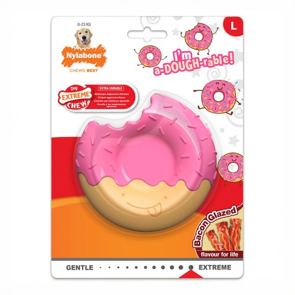 The Nylabone glazed donut is built from ultra‑tough nylon for extreme chewers, offering a fun donut shape with natural textures that promote cleaner teeth and fresher breath. Infused with irresistible bacon glaze flavour, it provides a satisfying way to indulge your dog’s chewing instincts. You can even spread treats inside the centre and freeze it for added enrichment, making it perfect for large dogs up to 23kg.