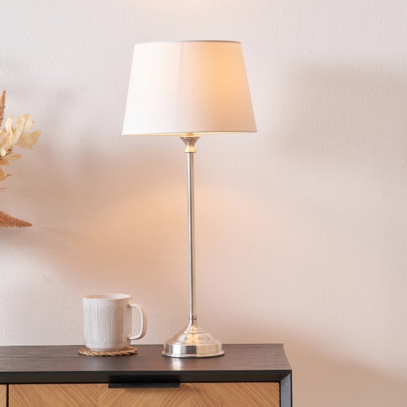 The Pacific Lifestyle Auden Minimalist Adelaide Table Lamp channels pure simplicity with a classic candlestick profile, stepped circular foot and sleek silver metal finish. Completed with a cotton‑mix shade and a convenient in‑line switch, this handcrafted‑in‑India piece proves minimalist can still make a statement.