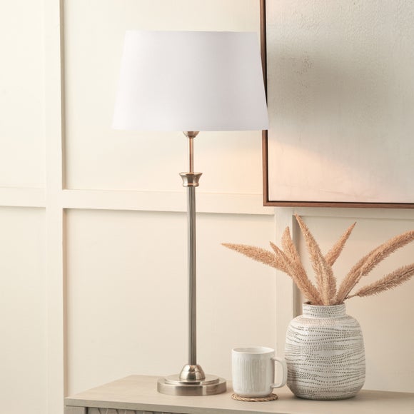 The Pacific Lifestyle Salvatore Winston Table Lamp leans traditional, featuring a sleek column stem with ribbed detailing and a stepped base. A handloom tapered shade and convenient in‑line switch add thoughtful finishing touches to this handcrafted‑in‑India classic.