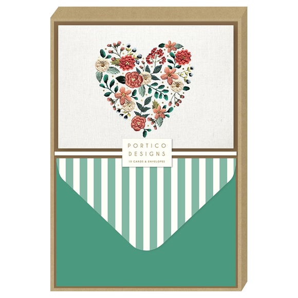 Send a thoughtful message with this beautifully designed set of notecards. Each card features a delicate embroidered-style heart, finished with gold foil and embossed details for a touch of texture. Perfect for thank-you notes, special occasions or just to let someone know you care, these cards make handwriting feel extra special. The set includes 10 cards and matching envelopes, all presented in a stylish box that’s ready to gift or keep for yourself.