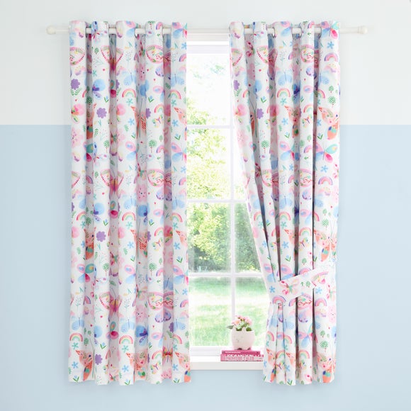 The Painted Butterfly Eyelet Curtains bring a burst of colour to any room with their bright butterfly design. The blackout lining ensures a restful sleep, while the eyelet header makes installation straightforward. Matching items are available to create a cohesive, vibrant space.