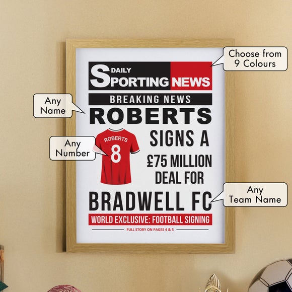 Bring the excitement of a record-breaking signing into your home with this bold newspaper-style print. Featuring dramatic headlines and space for your chosen name, team and shirt number, it creates a fun and unique keepsake for any football fan.
