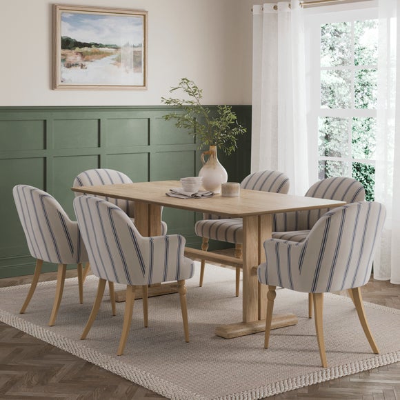 This dining chair features a compact frame paired with a soft foam‑filled seat, offering comfortable everyday support in a lighter, space‑saving silhouette. The folkstone stripe fabric adds a subtle pattern that brings texture and visual interest to your dining space, while the wooden legs provide a warm, natural finish.