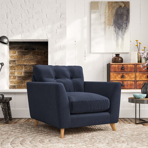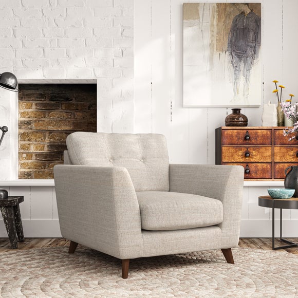 With its sleek, high-leg design and plush fibre-filled arm pads, this armchair offers both style and relaxation. The button-pull details on the supportive, fibre-filled back cushion add a refined touch, while the higher back cushion provides excellent support for your back and shoulders. Customise your Peyton armchair by selecting from a low-maintenance foam seat or a more relaxed 'Qualofill Blue' fibre seat. Featuring serpentine seat springs for durability, the chair is built to offer lasting comfort. The splayed hardwood legs, available in two finishes, are easy to fit and add a customisable element to the overall design.