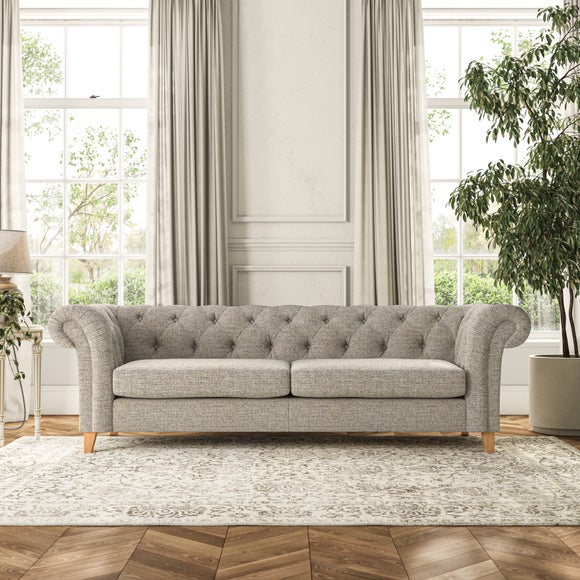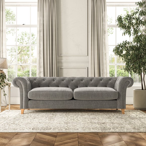 This sofa's authentic Chesterfield design features generously scrolled arms and deep buttoning, bringing a timeless elegance to your home. Built for durability, the sofa is equipped with serpentine seat springs for long-lasting comfort and a Superloop sprung back for excellent support. You have the option of a supportive, low-maintenance foam seat or a more relaxed 'Qualofill Blue' fibre seat, made from 100% recycled polyester, including post-consumer and ocean plastics. The self-sewn seat cushions offer a contemporary twist, while the hardwood legs, available in two finishes, provide a bespoke touch and are easy to fit.