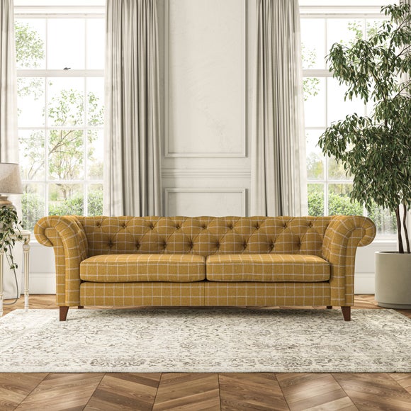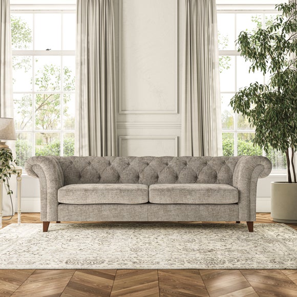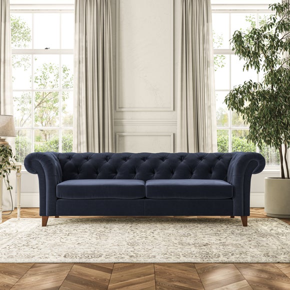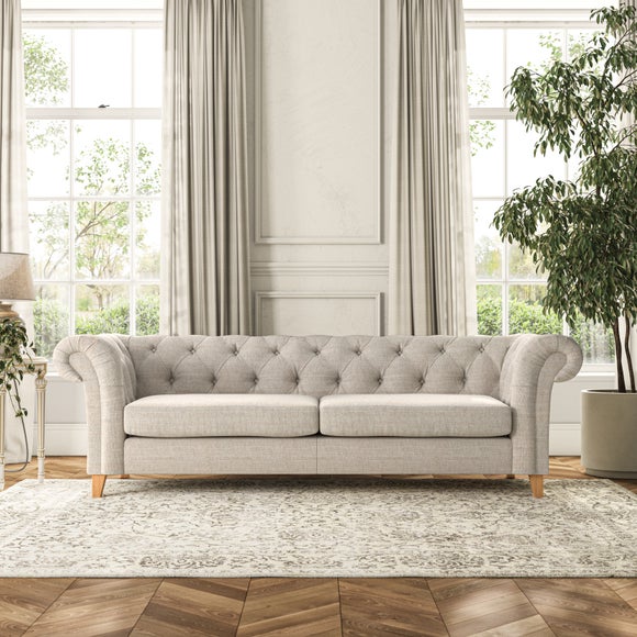 This sofa's authentic Chesterfield design features generously scrolled arms and deep buttoning, bringing a timeless elegance to your home. Built for durability, the sofa is equipped with serpentine seat springs for long-lasting comfort and a Superloop sprung back for excellent support. You have the option of a supportive, low-maintenance foam seat or a more relaxed 'Qualofill Blue' fibre seat, made from 100% recycled polyester, including post-consumer and ocean plastics. The self-sewn seat cushions offer a contemporary twist, while the hardwood legs, available in two finishes, provide a bespoke touch and are easy to fit.