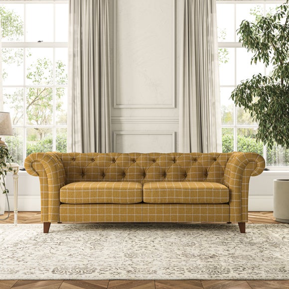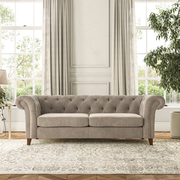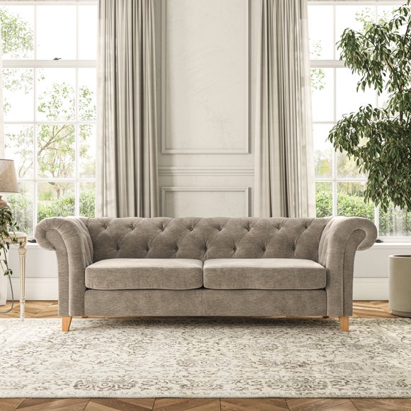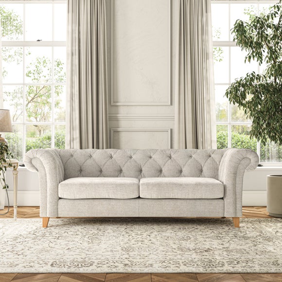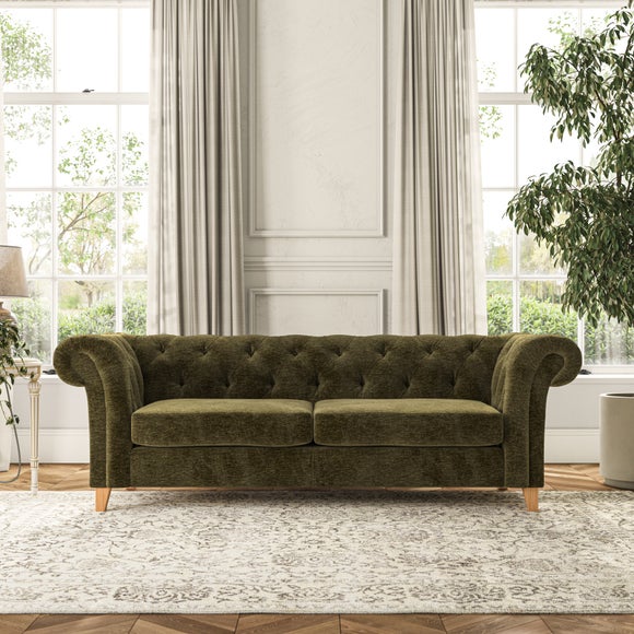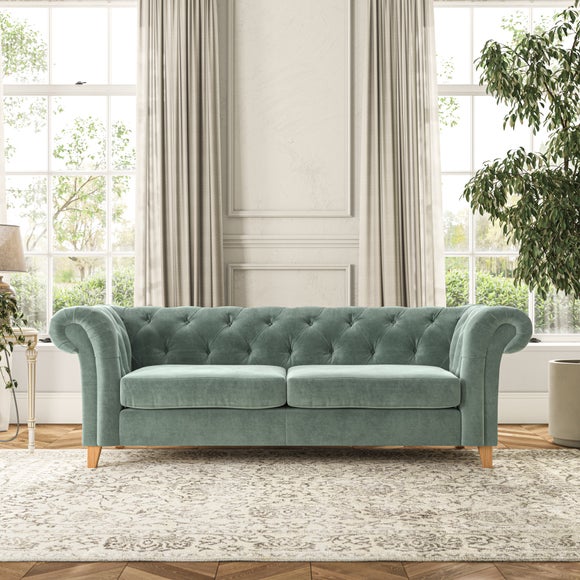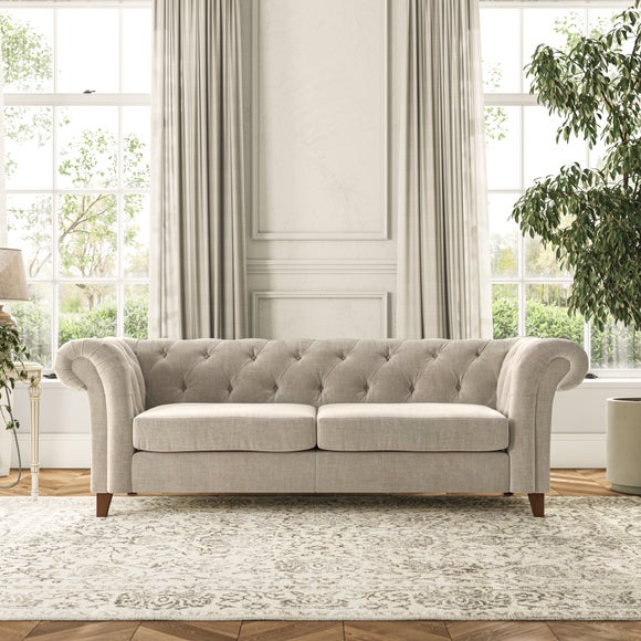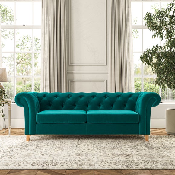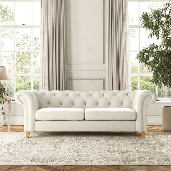 Featuring a classic Chesterfield design with generously scrolled arms and deep buttoning, this sofa adds a touch of elegance to any room. Designed with durability and comfort in mind, it comes with serpentine seat springs for long-lasting support and a Superloop sprung back for excellent back support. You can choose between a supportive, low-maintenance foam seat or the more relaxed 'Qualofill Blue' fibre seat, which is made from 100% recycled polyester, including post-consumer and ocean plastics. The self-sewn seat cushions provide a contemporary twist, while the hardwood legs, available in two finishes, offer a customisable touch and are easy to fit.
