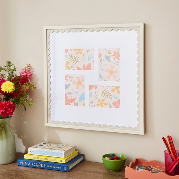 Bring a playful touch to your décor with the Remi Scalloped Square Multi Photo Frame, designed with a gently scalloped border for a distinctive finish. The square mount features four apertures, making it easy to curate a mini gallery of your favourite moments. Its soft colour palette blends effortlessly into modern, airy interiors - hang it as a standalone statement piece or style it among your existing wall art for a coordinated look. The perfect way to display memories with colour and character.