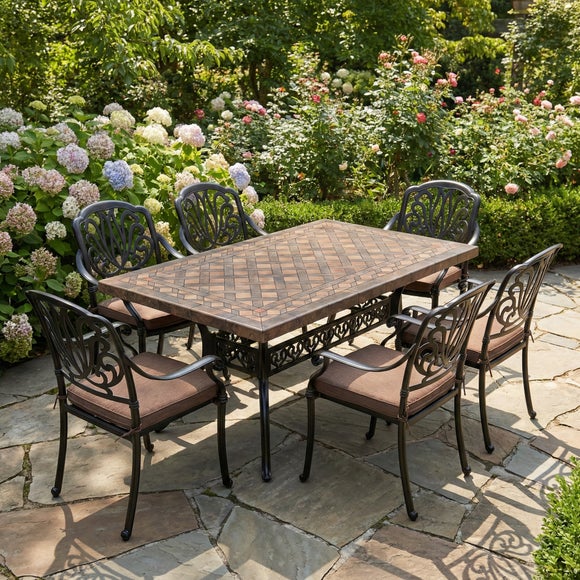 The Roselane and Florendale set is the ultimate solution for spacious outdoor dining. This expansive 147cm x 90cm table features a detailed mosaic-effect top, perfectly paired with six Florendale chairs. These chairs are not only stylish but highly practical, featuring soft cushions for premium comfort and a stackable design for effortless storage. Built from durable cast aluminium, the entire set is designed to withstand the elements while maintaining its elegant appearance. It is a low-maintenance, lightweight ensemble that brings a classic, homey feel to any garden or terrace.