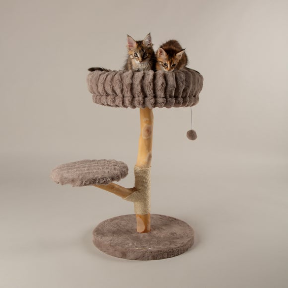 This is a versatile tree that combines sleep, scratch and play in one stylish design. The extra-large top bed with high sides offers a secure and cosy spot for curling up or stretching out, while removable bedding makes cleaning simple. The strong pear wood post wrapped in sisal supports claw maintenance, and the stepped perches encourage climbing and exploration. Plush faux fur adds warmth across all resting points, and dangling toys provide stimulation. Assembly is quick and straightforward with tools included.