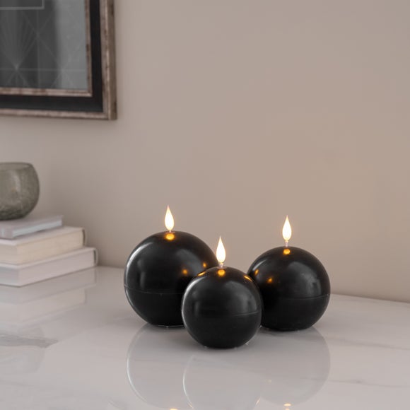 Elevate your home decor with this set of three Sphere LED Candles, designed to bring a touch of minimalist elegance to any room. Crafted from real wax for an authentic feel, these unfragranced candles feature a modern, spherical design that fits perfectly with contemporary styles. The artificial LED flames emit a warm, golden glow, creating a cosy and inviting sanctuary without the maintenance of traditional wicks. Please note that this set requires 2 x AAA and 4 x AA batteries, which are available separately.