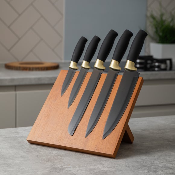 Keep your knives neat and within easy reach with this sleek black magnetic block. Each of the five knives attaches securely and stays put, giving you a practical yet attractive display. With a knife for chopping, slicing and prepping, you've got every recipe covered. The open, space saving design makes it quick to grab the blade you need. A smart, modern addition to your worktop that brings order to busy kitchens.
