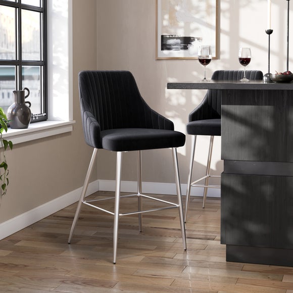 The Shea barstool brings a luxurious touch to your kitchen or dining space with its soft upholstery and elegant silhouette. Designed for comfort and style, it features a supportive high back, gently curved arms, and a foam-filled seat for relaxed dining or casual drinks. Upholstered in plush velvet, the stool sits at counter height, ideal for kitchen islands and breakfast bars, and rests on a sturdy metal base with a built-in footrest.