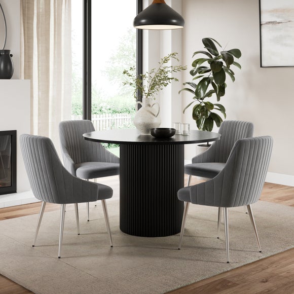 Upholstered in sumptuous velvet fabric, these chairs offer both style and comfort for your guests. With their sleek design and rich texture, they add a touch of sophistication to any dining room.