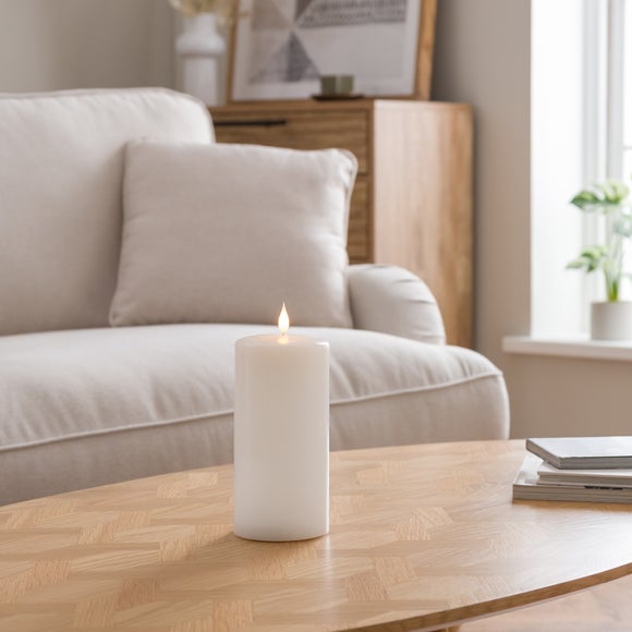 Set a serene mood in your home with the Soft Glow LED Pillar Candle. This elegant, unscented piece is crafted from real wax and features a sophisticated artificial LED flame with a realistic flicker effect. For ultimate convenience, it includes a handy timer function and remote control, allowing you to automate your evening ambience effortlessly. Its neutral colourway ensures it complements any interior palette. This durable, flameless candle requires 2 x AA batteries (not included), offering a safe and beautiful alternative to open flames.