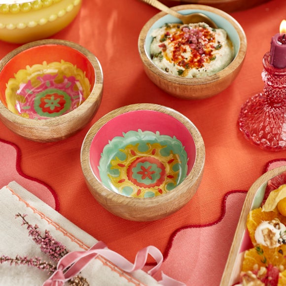 A unique patterned design and bold colour palette make this dip bowl a real statement on the table. Crafted from durable, high‑quality mango wood, it brings everyday toughness with an eye‑catching finish that’s perfect for serve ware that gets noticed.
