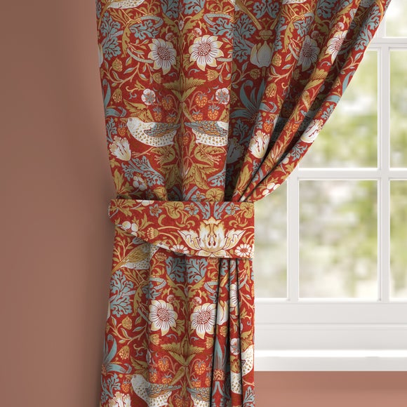 Elevate your window dressings with the Strawberry Thief Velvet Made to Order Tieback, crafted from sumptuous, opulent velvet that showcases the iconic William Morris Arts and Crafts design. This exquisite tieback features the classic Strawberry Thief pattern in a rich, exclusive Dunelm colourway, perfectly complementing your made to measure curtains or Roman blinds for a coordinated and polished look. Designed for both beauty and function, the tieback gently holds back your curtains while adding a decorative flourish that enhances the overall elegance of your space. Available with your choice of a plain or piped edge, this bespoke tieback is tailored to your specifications and finished with exceptional British craftsmanship. Ideal for creating a harmonious and luxurious interior, it pairs effortlessly with other items in the collection, such as cushions and fabric by the metre. This tieback is a subtle yet impactful detail that brings together tradition, quality, and style in perfect balance.