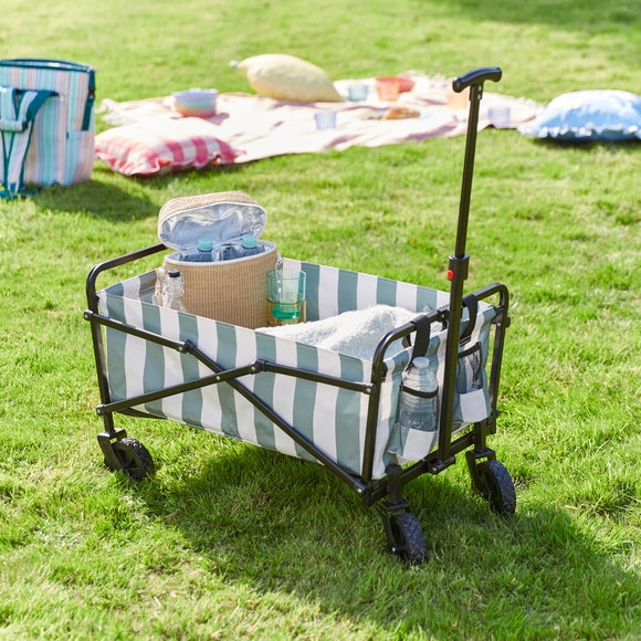 The Striped Camping Trolley is a handy companion for days out, designed to make carrying your essentials effortless and stylish. Its collapsible frame means it folds down neatly when not in use, while the roomy interior and helpful side pockets are perfect for stashing water bottles, snacks and all those little extras you need close to hand. The adjustable handle helps make rolling smooth and comfortable, and the tough off‑road wheels are built to handle everything from sandy beaches to bumpy festival fields. A practical, good looking solution for hassle free adventures.
