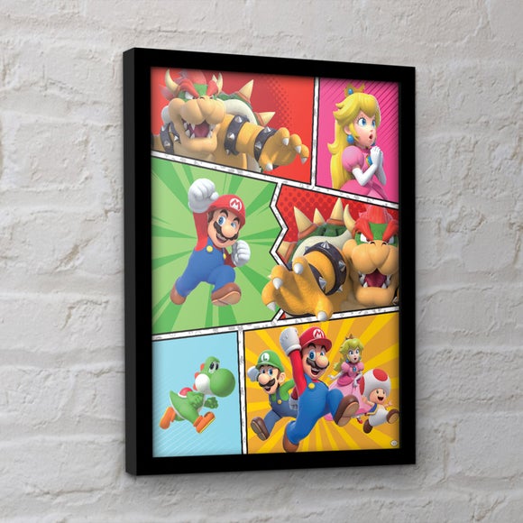 Bring bold colour and character to your walls with this vibrant Super Mario Comic Strip Framed Print. Featuring comic-style panels of Mario, Bowser, Yoshi, and other beloved characters, this piece brings nostalgic fun and energy to any space. The slim black frame adds a sleek finish, while the lightweight styrene glazing makes it safe and easy to handle. Complete with a sawtooth bracket for quick hanging, it’s ideal for bedrooms, gaming rooms, or gifting to a Nintendo fan.