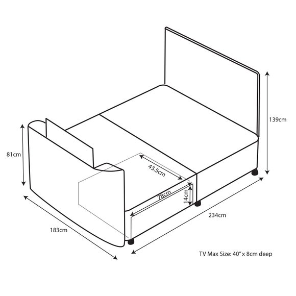 Bring comfort, storage and entertainment together with the Sweet Dreams Opulence Studded TV Bed. The studded headboard adds a stylish feature while the side lift ottoman base provides generous hidden storage for bedding and more. The foot end is TV ready so you can enjoy your favourite shows from the comfort of your bed. Please note TV is not included as this frame supports screens up to 40 inches with a maximum depth of 8 cm. A remote controlled mechanism makes it easy to raise and lower your TV and it must be mains connected for use. Available in a choice of colours to suit your bedroom.