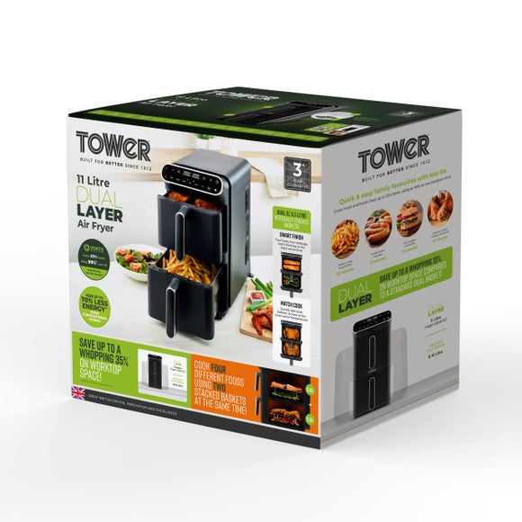 The Tower 11L Twin Stack Air Fryer is the perfect kitchen companion for cooking large, delicious meals in no time. With two 5.5L baskets, it offers a generous 11L capacity, and 6 preset cooking options including Fries, Wings, Steak, Veg, Bake, and DIY, so you can cook a variety of dishes with ease. The Smart Finish feature ensures both dishes are ready at the same time, while the Match Cook function synchronises the settings in both baskets for perfect results. With a temperature range of 50-210°C and a time range of 1-60 minutes, it’s versatile enough for every meal. Thanks to rapid air circulation technology, you can enjoy crispy food with little to no oil for healthier meals. Plus, with handy accessories like two grill plates and cooking racks, it’s ready to cook up a feast in style.