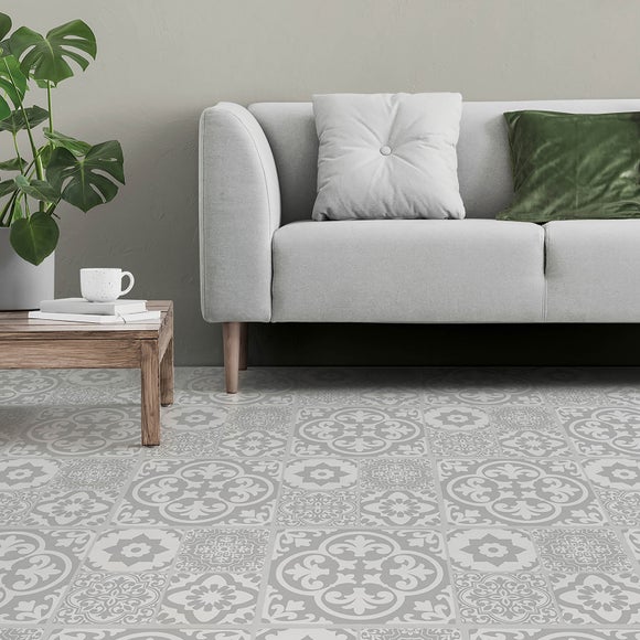 Add a touch of charm with the Valencia oversized floor tiles, featuring a gorgeous patterned design. Ideal for quick and easy floor transformations, they install effortlessly with a peel-and-stick method. No grout or special tools needed, and they’re water-resistant and washable for hassle-free maintenance.