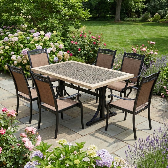 Make a grand statement with the Washington dining set, featuring a premium 147cm table with a hand-laid natural marble mosaic top. This spacious set comfortably accommodates six guests, making it perfect for hosting memorable meals. The table is supported by powder-coated steel legs with adjustable feet for total stability, while the Montrose chairs provide supportive textilene seats and strong aluminium frames. These chairs are stackable and require no assembly, offering a versatile, high-end dining solution that combines the beauty of natural stone with long-lasting, weather-resistant durability.