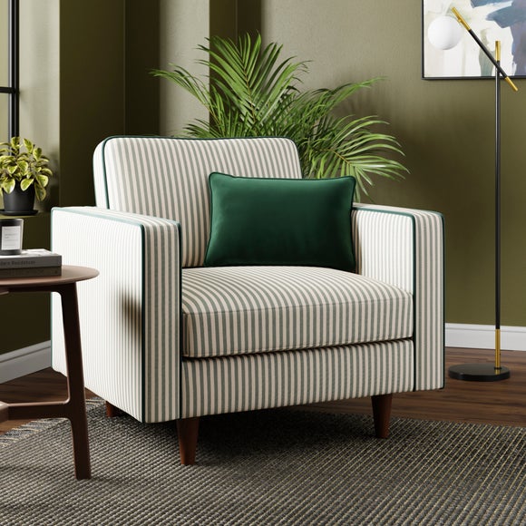 Upholstered in a beautifully textured fabric featuring subtle stripes, this armchair brings a sophisticated yet playful element to any room. Its clean lines and tailored finish give it a refined look, while the plush seat and supportive backrest ensure comfort for hours of lounging or entertaining.
